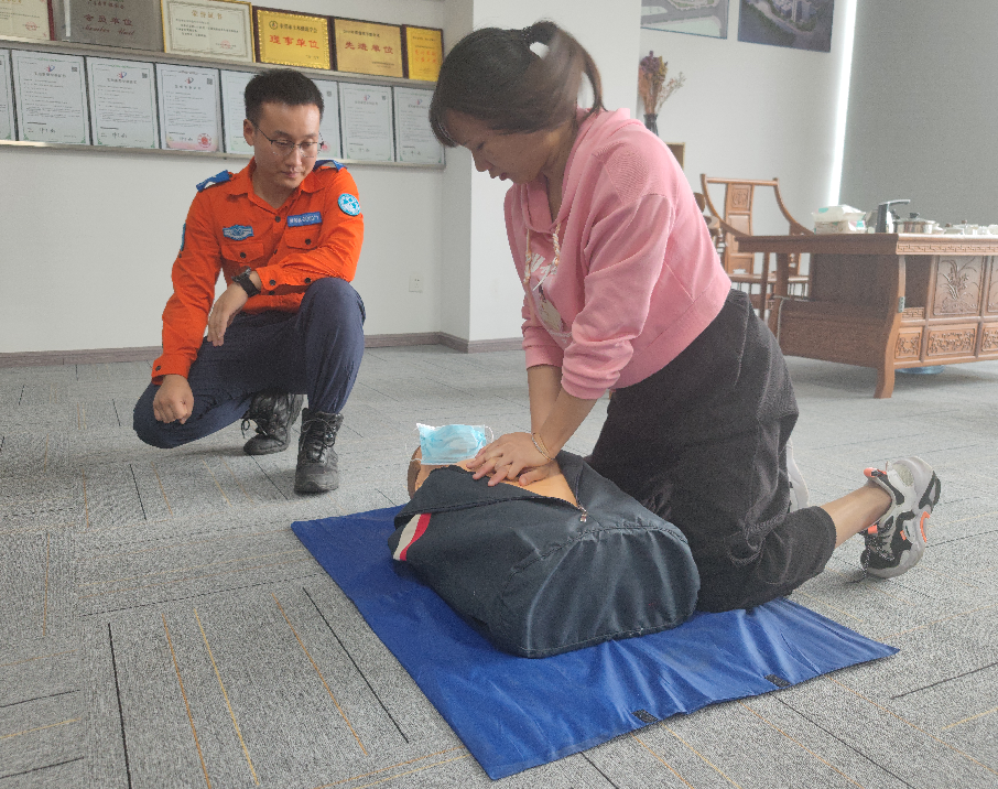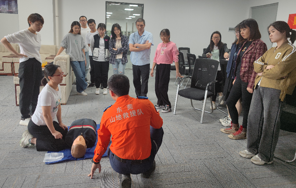 為豐富員工的突發應急救護意識,提升群眾性應急救護能力,公司特邀請東莞登協山地救援隊——關智超來給員工講解應急救護知識,并進行心肺復蘇(CPR)演練。