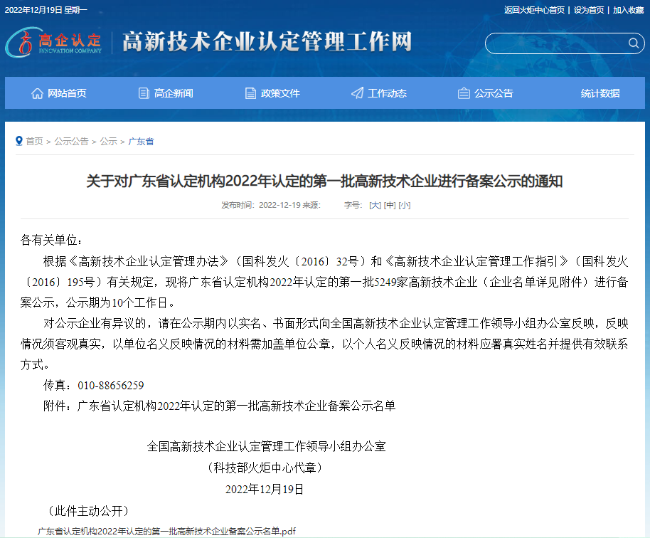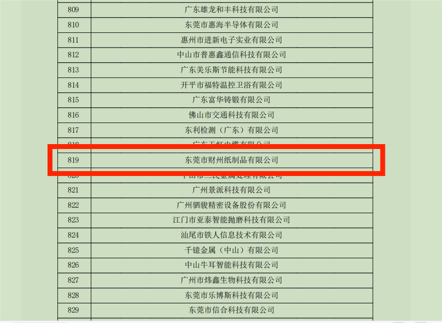 根據《高新技術企業(yè)認定管理辦法》(國科發(fā)火〔2016〕32號)和《高新技術企業(yè)認定管理工作指引》(國科發(fā)火〔2016〕195號)有關規(guī)定,現(xiàn)將廣東省認定機構2022年認定的第一批5249家高新技術企業(yè)(企業(yè)名單詳見附件)進行備案公示,公示期為10個工作日。廣東財州科技有限公司(原名:東莞市財州紙制品有限公司)名列其中。