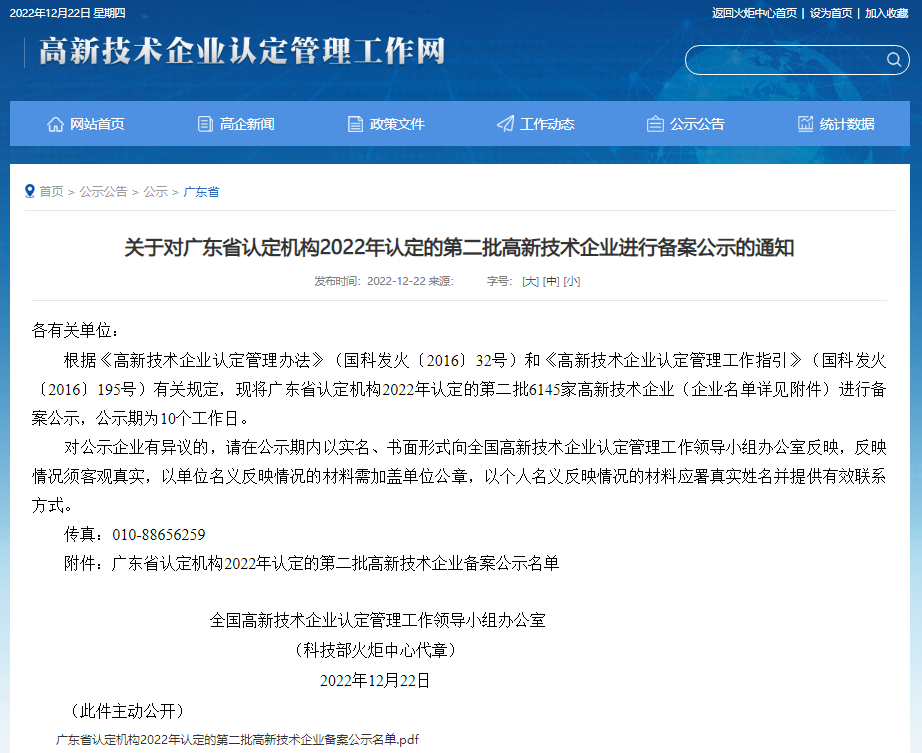 根據(jù)《高新技術(shù)企業(yè)認(rèn)定管理辦法》(國(guó)科發(fā)火〔2016〕32號(hào))和《高新技術(shù)企業(yè)認(rèn)定管理工作指引》(國(guó)科發(fā)火〔2016〕195號(hào))有關(guān)規(guī)定,現(xiàn)將廣東省認(rèn)定機(jī)構(gòu)2022年認(rèn)定的第二批6145家高新技術(shù)企業(yè)(企業(yè)名單詳見(jiàn)附件)進(jìn)行備案公示,公示期為10個(gè)工作日。廣東喜洋洋紙業(yè)有限公司名列其中。