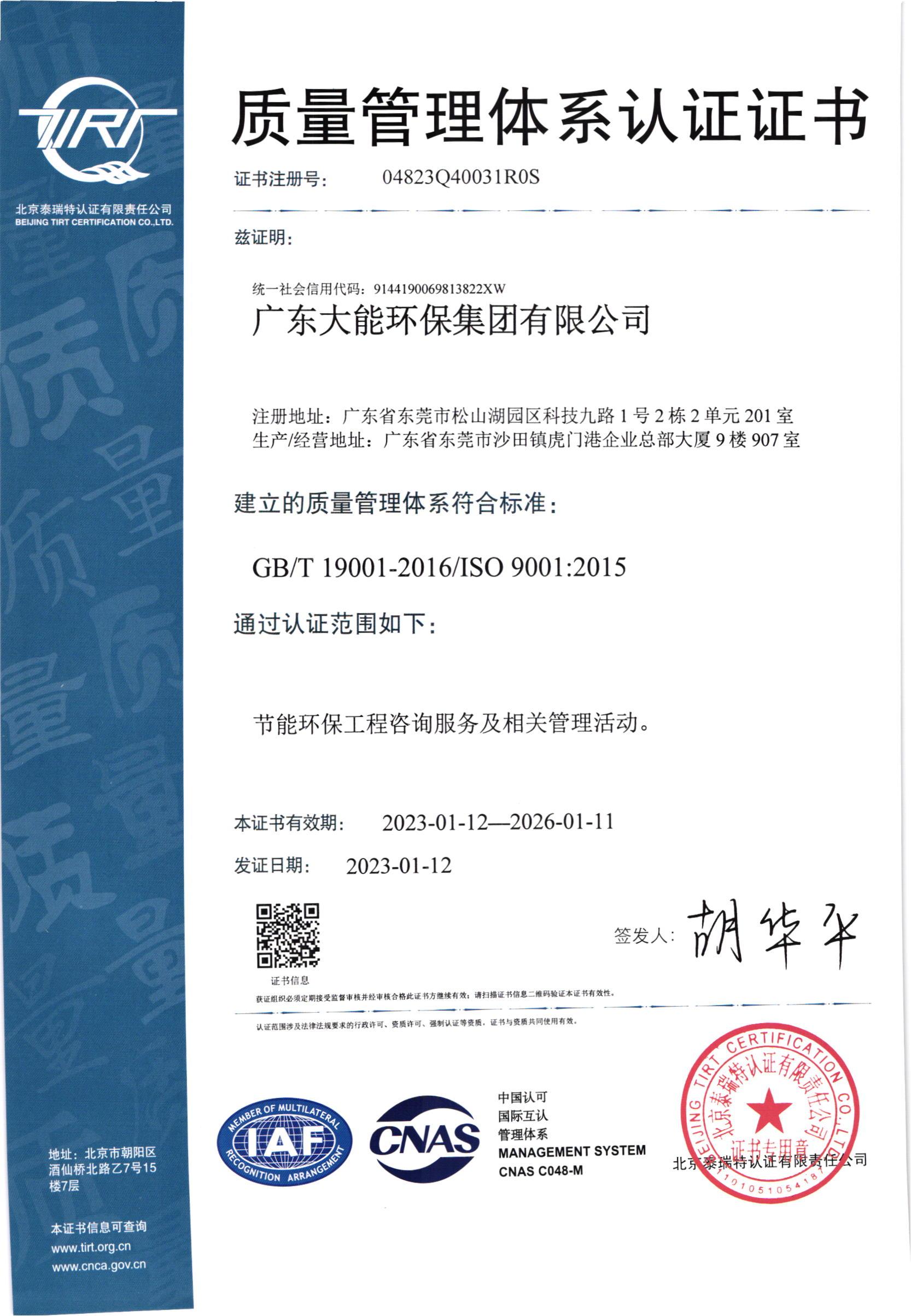 祝賀廣東大能環保集團有限公司順利獲得ISO三體系認證!